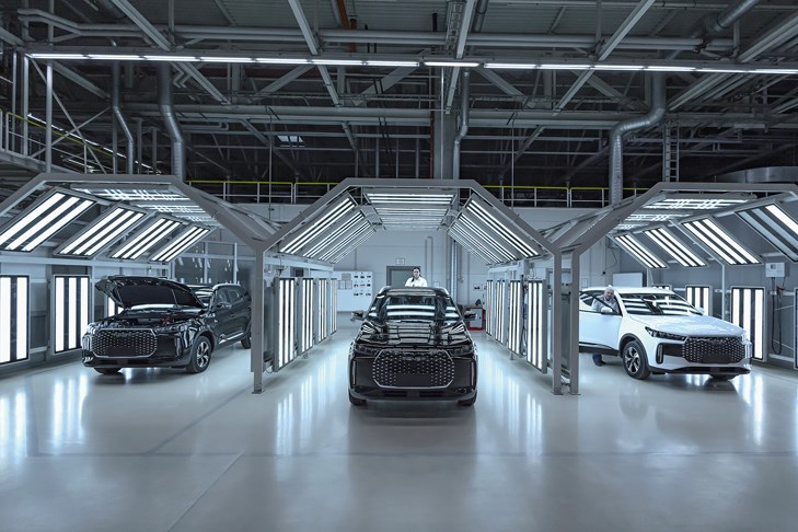 Местным инженерам удалось синхронизировать работу немецких и китайских роботов, и они уже вышли на проектную мощность 41 кузов в час. Сейчас при двухсменном графике работы получается около 500 машин в день. Если добавить третью смену, то завод сможет выпускать до 200 тыс. машин в год. Пока производство только разгоняется, число постов контроля качества заметно увеличено по сравнению с тем количеством, что было при немцах. Один-два кузова в смену отправляют в измерительную лабораторию для оценки точности получаемых изделий, также периодически проводятся так называемые зубильные тесты, когда сотрудники отдела контроля качества разрывают сварные швы, чтобы проверить качество изготовления кузова. Практически все внешние панели имеют оцинковку, у Tenet Т8 цинк есть даже на крыше.