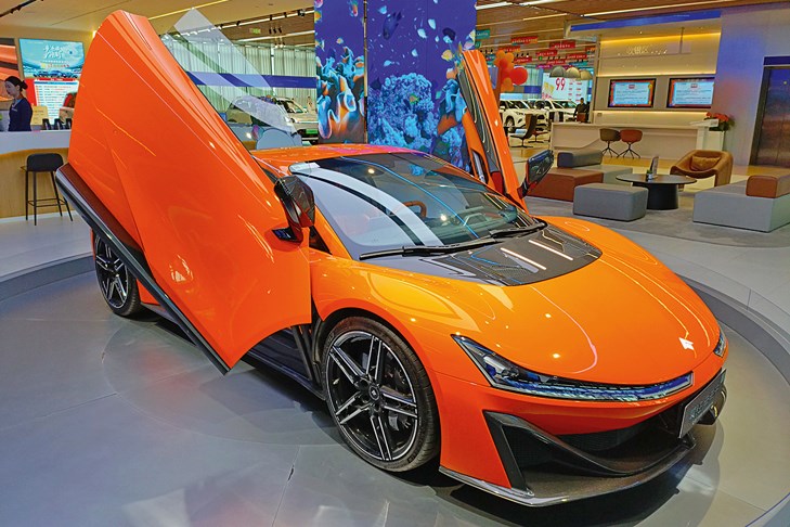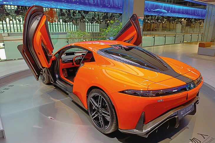 Другой электрический суперкар под суббрендом Yangwang показала компания BYD Auto. Это Yangwang U9, который прославился тем, что в ноябре 2024‑го показал самое быстрое несертифицированное время прохождения круга Nürburgring Nordschleife — 7 мин 17,9 с. По состоянию на сентябрь 2025 года его версия Xtreme является самым быстрым серийным электромобилем в мире с максимальной скоростью 496 км/ч. U9 оснащен четырьмя электродвигателями общей выходной мощностью порядка 1300 л.с. Запас хода — около 450 км. Время разгона 0–100 км/ч — 2,36 с. U9 комплектуется электрической системой на 800 В с максимальной постоянной мощностью зарядки 500 кВт. Время зарядки от 30 до 80% — 10 мин. U9 также поддерживает двойную зарядку, то есть одновременное подключение двух зарядных устройств для увеличения скорости зарядки.