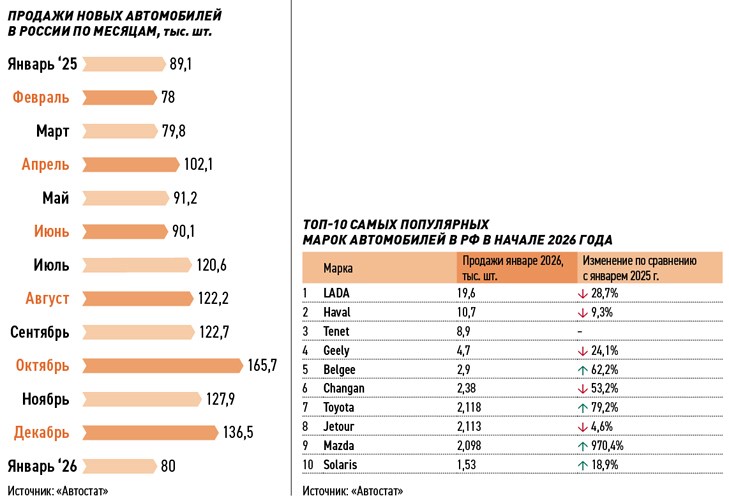 Так, впечатляющий рывок в начале года сделала марка Tenet, которая только осенью 2025 года приступила к выпуску машин на бывшем заводе Volkswagen под Калугой. В январе спрос на автомобили этого бренда достиг отметки 8,9 тыс. единиц, марка заняла уже значимые 11,1% рынка и почти догнала прежнего лидера среди иномарок — Haval, который развивает свой завод под Тулой и закончил январь с показателем 10,7 тыс. авто (на 9% ниже января прошлого года).