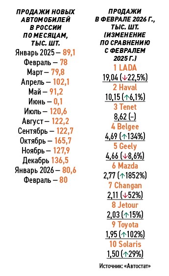 Восемьдесят тысяч проданных новых автомобилей — с такими результатами российский авторынок завершил февраль 2026 года, сообщает «Автостат». Это на 3% меньше, чем в феврале 2025‑го, и всего на 1% уступает показателю 2026 года. В сумме же за первые два месяца наступившего года было продано 160,6 тыс. автомобилей, что на незначительные 4% ниже, чем за аналогичный период прошлого года. Тогда рынок падал существеннее: напомним, что по итогам 2025‑го он сжался на 15,6%. Таким образом, динамика текущего года вызывает сдержанный оптимизм, позволяющий надеяться на то, что спрос на автомобили в России как минимум стабилизируется.