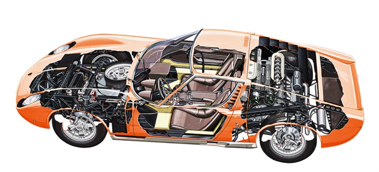 Однако уже через месяц, на Туринском автосалоне, Lamborghini взорвала бомбу. Заряд сокрушительной силы предстал на стенде компании в виде 400 ТР, «голого» шасси. Но какого! Вместо трубчатого каркаса, как у 350 GT, — платформа из стали толщиной 0,8 мм с приваренными к ней кессонами с множеством крупных отверстий для снижения массы. Действительно, вся эта конструкция весила каких-то 75 кг! Дальше — больше: в передней части шасси расположились уложенные плашмя радиатор ДВС с парой вентиляторов и запаска. А где же сам двигатель? Он помещался за двухместным кокпитом строго в пределах базы. Никакой «гири» в заднем свесе, которая, как на том же Porsche 911, в виражах давила бы на психику даже пилотов-профи. К тому же ДВС, 5‑ступенчатая механика и самоблокирующийся дифференциал делили общий картер, и в довершение всего этот силовой блок был развернут поперечно. Собственно, аббревиатура ТР в буквенно-цифровом индексе шасси и означала Trasversale Posteriore (в пер. с ит. — «поперечное заднее» (расположение). Ничего подобного автомобильный мир еще не видел!