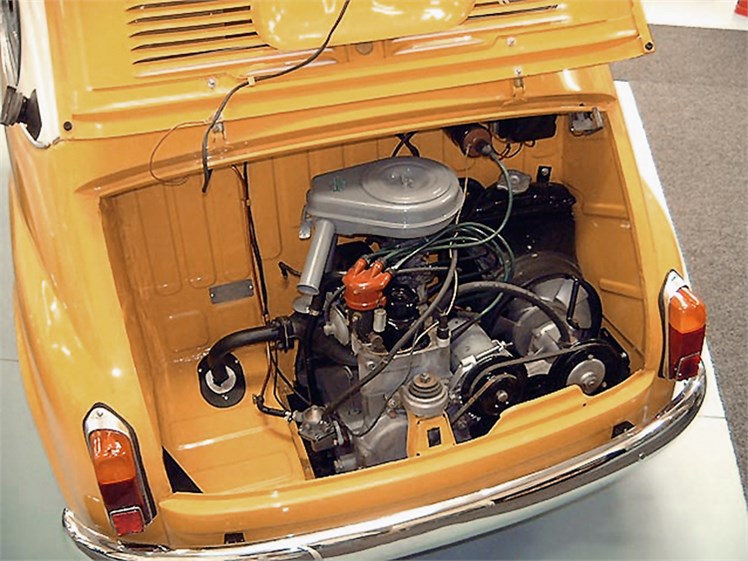 Обуздать расходы позволял один из двух экономящих материалы, вес и средства вариантов компоновки — «все спереди» или «все сзади». Опыт проектирования переднеприводников у Fiat на тот момент отсутствовал, как не было и отлаженных технологий производства полуосей со ШРУСами, а также времени на эксперименты. Значит, схема переворачивается на «все сзади». Тоже впервые в истории Fiat. Но в пользу такого выбора говорил хотя бы успешный опыт конкурентов. Заднемоторные VW «Жук» и Renault 4CV уже вполне заявили о себе. Стремясь получить максимальный внутренний объем при компактных габаритах автомобиля, Джакоза сначала по примеру VW сделал ставку на оппозитный двигатель, но затем, как и французы с их 4CV, отдал предпочтение рядной «четверке» с водяным охлаждением.
