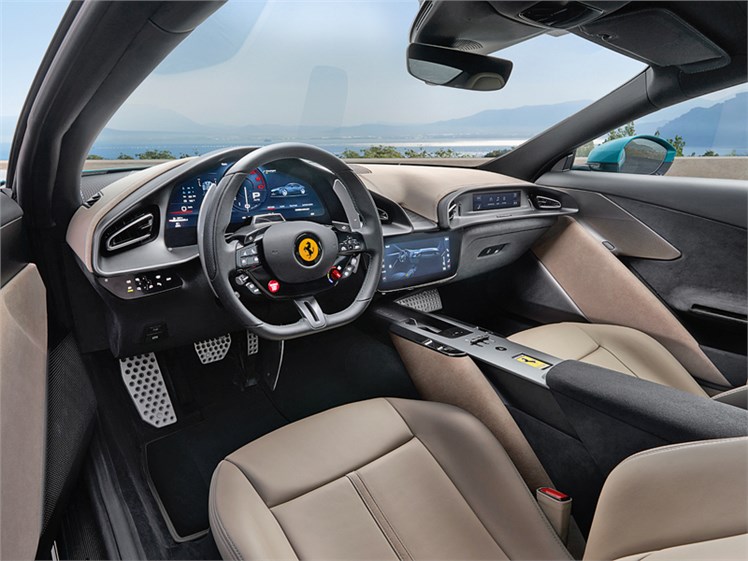 В салоне есть ряд приятных изменений по сравнению с Roma. Неудобные сенсорные элементы управления на руле были заменены на «физические» кнопки. Меню Apple CarPlay/Android Auto перенесено с 15,6‑дюймовой приборной панели на 10,25‑дюймовый центральный экран, который теперь расположен не вертикально, а горизонтально. Под ним находится центральная консоль с покрытием из анодированного алюминия, которая передает невероятные тактильные ощущения, не свойственные современным «пластиковым» машинам.