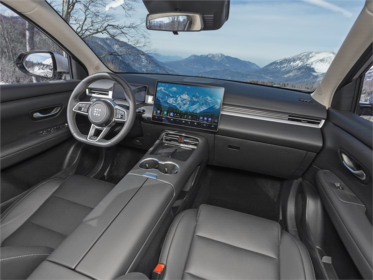 Но подвеска не задубела, в чем мы удостоверились, поднимаясь по кочковатой грунтовке к площадке, с которой открывался великолепный вид на гору Фишт. С этим «спецучастком» справилась бы, вероятно, и FWD-версия, но ей точно пришлось бы тяжелее на отрезке с обледеневшей колеей. У i-Space 4х4 на такой случай имеется режим «Снег», в котором тяга между осями фиксируется электроникой в соотношении 50:50. Это спецсредство вместе с имитацией межколесных блокировок помогло кроссоверу одолеть внушительную груду щебня, не прибегая к способу «газ в пол!» Главное, чтобы в таких ситуациях уровень заряда тяговой батареи не просел ниже 15%, после чего автомобиль превращается в переднеприводный. Такое — пока — возможно, если электроника, зафиксировав низкую скорость, решит, что вы движетесь по городу, где полный привод необязателен. Спорное решение, особенно в рекордные снегопады, как нынешней зимой. Напрашивается добавление еще одного, «оффроудного», режима, гарантированно предотвращающего опустошение батареи до нежелательного уровня. Работа в этом направлении с китайскими поставщиками машинокомплектов уже ведется. В любом случае полноприводник Evolute, «загримированный» под обычный i-Space, во многом другой, более цельный, разносторонний автомобиль. Лепота!