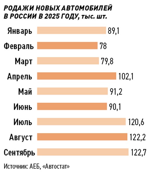 122,7 тыс. новых машин в России нашли своих владельцев по итогам сентября, что стало лучшим результатом 2025 года. Спрос в первый месяц осени на 500 автомобилей (или на 0,35%) превысил продажи в августе, и это почти на 60% больше, чем было реализовано, скажем, в феврале текущего года. Хотя по сравнению с продажами прошлого года рынок остается в большом минусе. Результаты сентября оказались на 19% ниже сентября 2024‑го, а общий спрос за девять месяцев в 895 тыс. автомобилей на 22% уступает показателям аналогичного периода прошлого года.